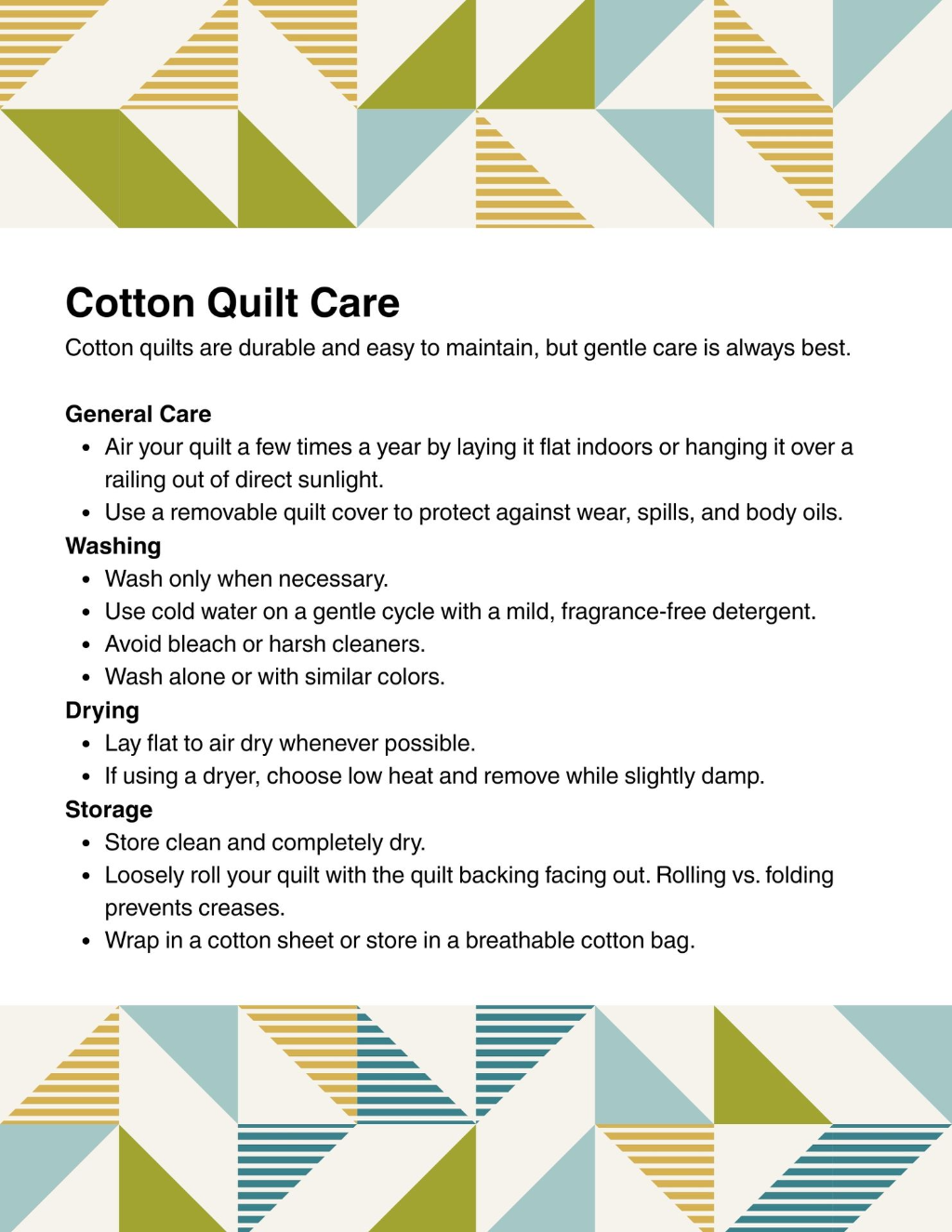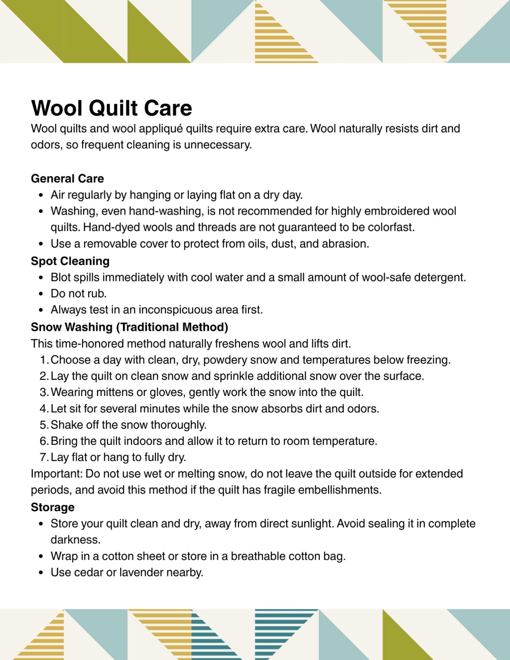 We’ve created both a Cotton Quilt Care Guide and a Wool Quilt Care Guide, available as downloadable PDFs. They’re perfect for keeping close to your treasured quilts or tucking in with a quilt given as a gift.