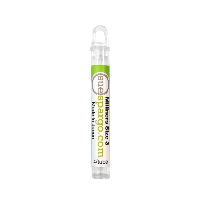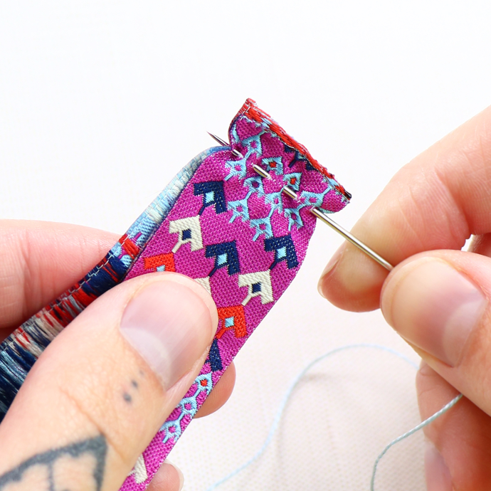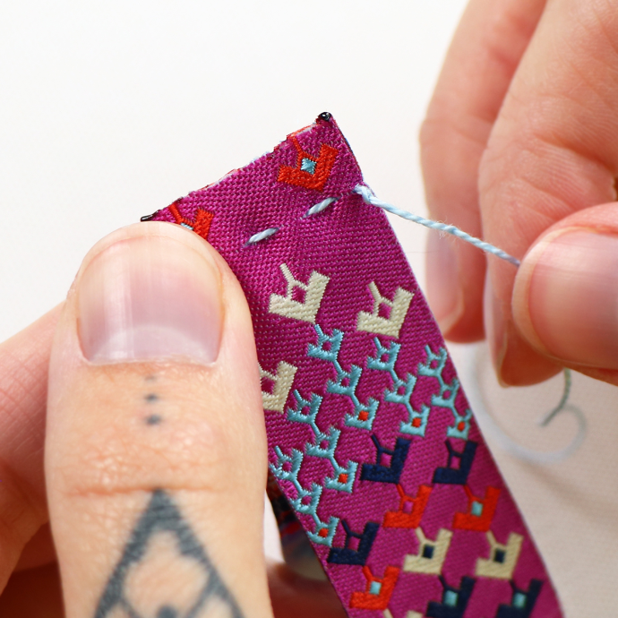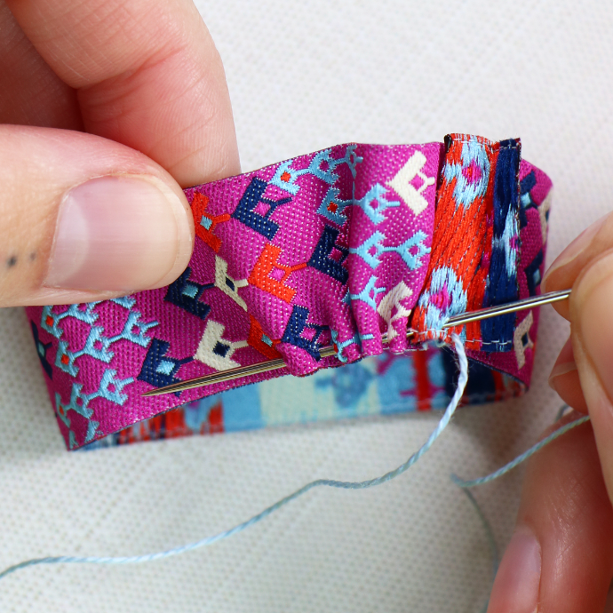 With a #3 Milliners Needle and #8 Eleganza Perle Cotton, make a running stitch along your two cut edges, WRONG sides together. You will want your 1/4" seam to be on the woven side of the ribbon. Tie a knot once you reach the opposite end.