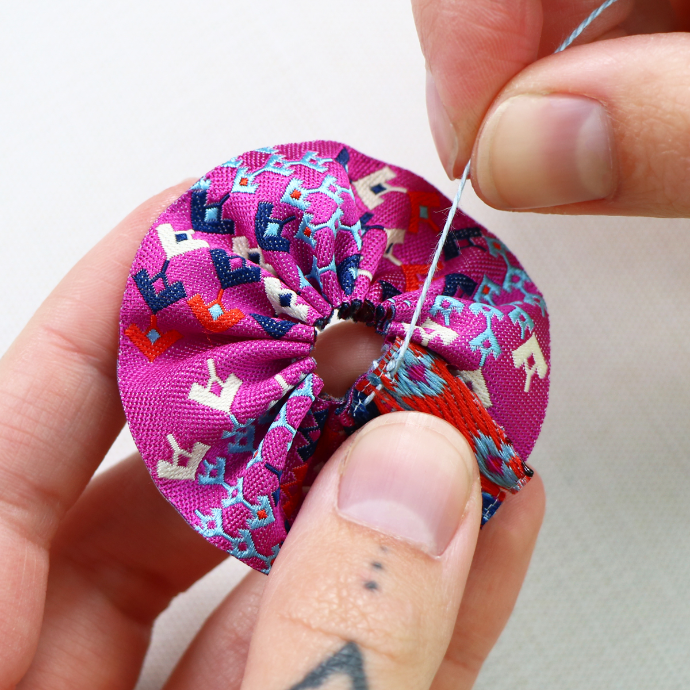 Once you reach the starting point, pull firmly on your thread, drawing your ribbon into a circular shape. Tie a knot once you are happy with the size and shape of your circle.
