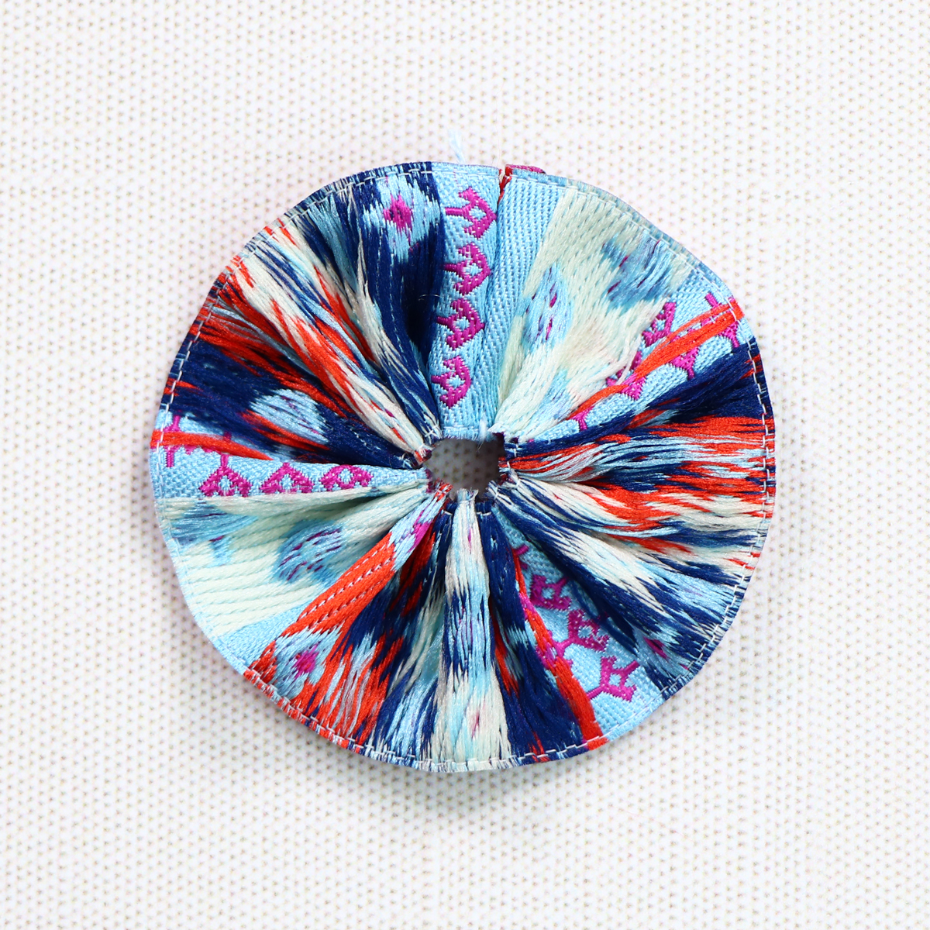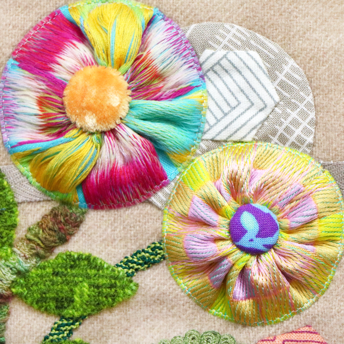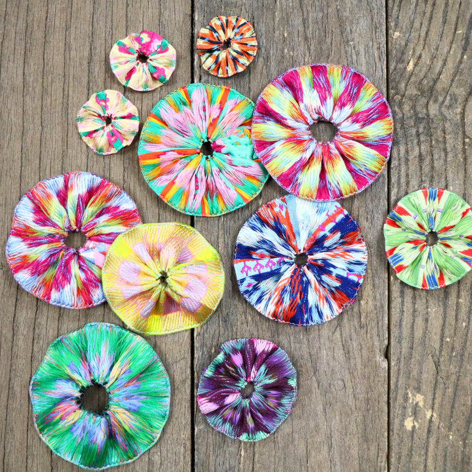 Now, flip your ribbon over. The unwoven backside is going to be the star of the show! This side of the ribbon adds visual interest and creates gorgeous blooms! Now, you can appliqué your ribbon to your piece with a matching Efina thread. You can choose to leave the center open or add a button or embroidery stitches. Get creative and think of all the ways you can utilize these one-of-a-kind reverse ribbon circles!