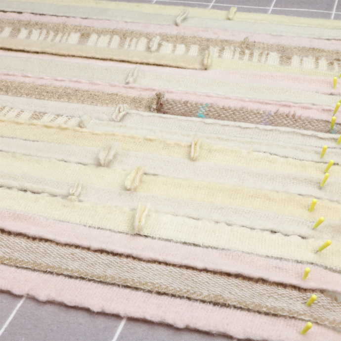 Create your foundation, which is called the warp, by pinning down vertical selvedges. Line up the strips so that they touch, and use the grid lines to keep everything straight. Each strip should be pinned down at the top and bottom. Do not stretch the wool selvedge strips when pinning them, as this can result in distortion later. Make your weaving as small or as large as you would like.