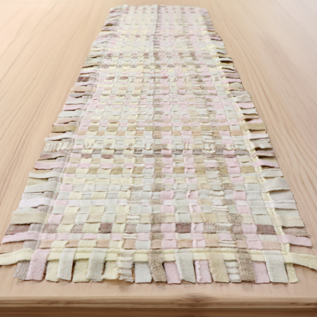 We turned this weaving into a gorgeous table runner! We followed the beginning construction steps for the woven pillow in Contemporary Patchwork but adapted the pillow front to turn it into a gorgeous table runner! We left the edges unbound for a natural, organic look.