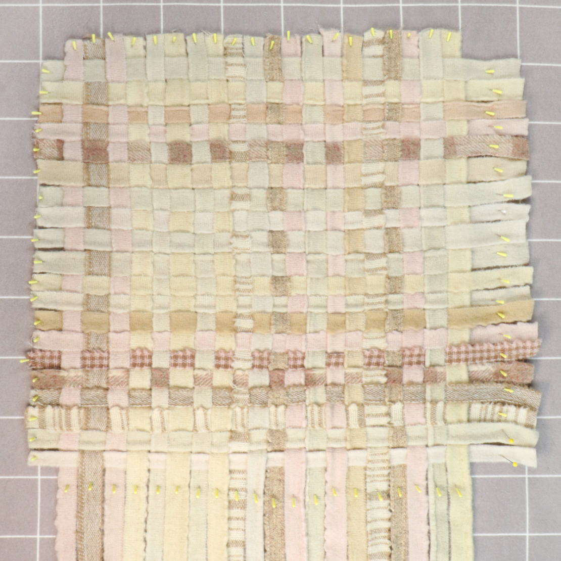 Use the grid to keep your weft strips straight and horizontal. Use your fingers to manipulate each strip in place, leaving no gaps between strips. Pin down the end of each strip without stretching it.