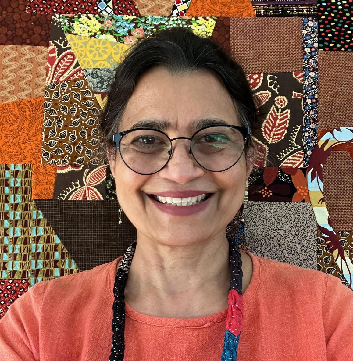 Drawn to imperfections and irregularities of handmade crafts, Sujata believes each quilt has personality of the maker. Using imperfections as design element has led her to abstract interpretations of traditional quilt blocks. She finds hand stitching therapeutic and nourishing to the soul, ultimately helping her write personal stories in stitches.