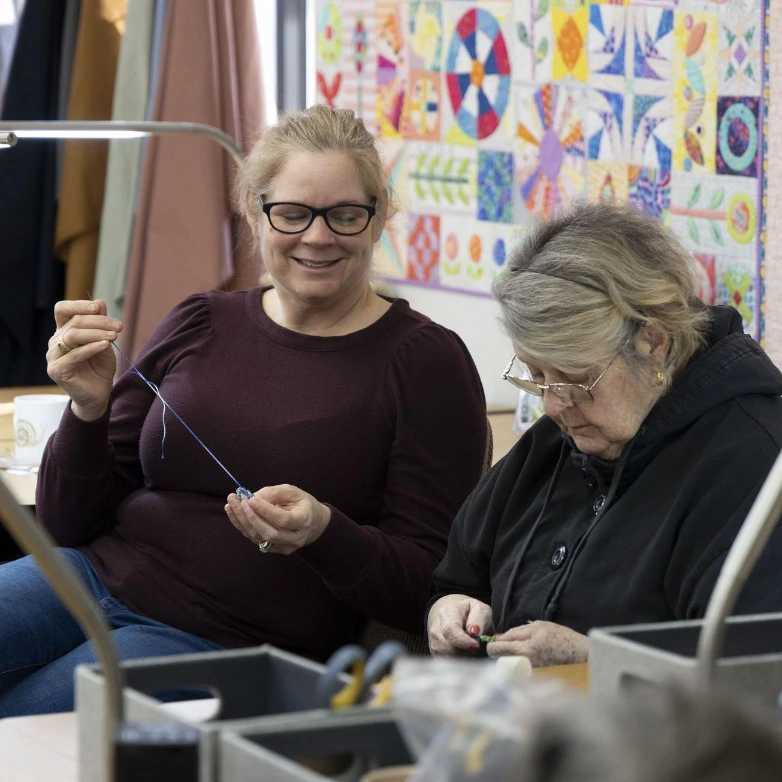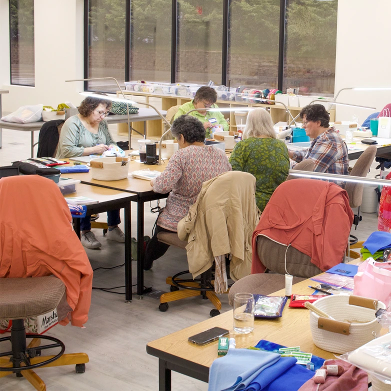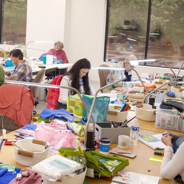 - Craft scissors, writing utensils, trash container, and work light are available on each classroom table. Each table is also equipped with multiple electrical outlets and USB ports for plugging in sewing machines, chargers, etc.