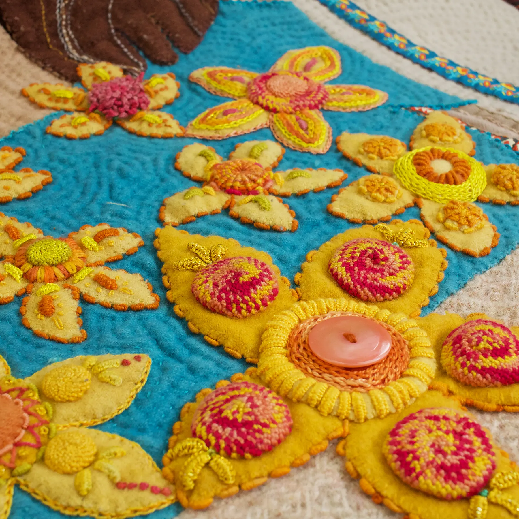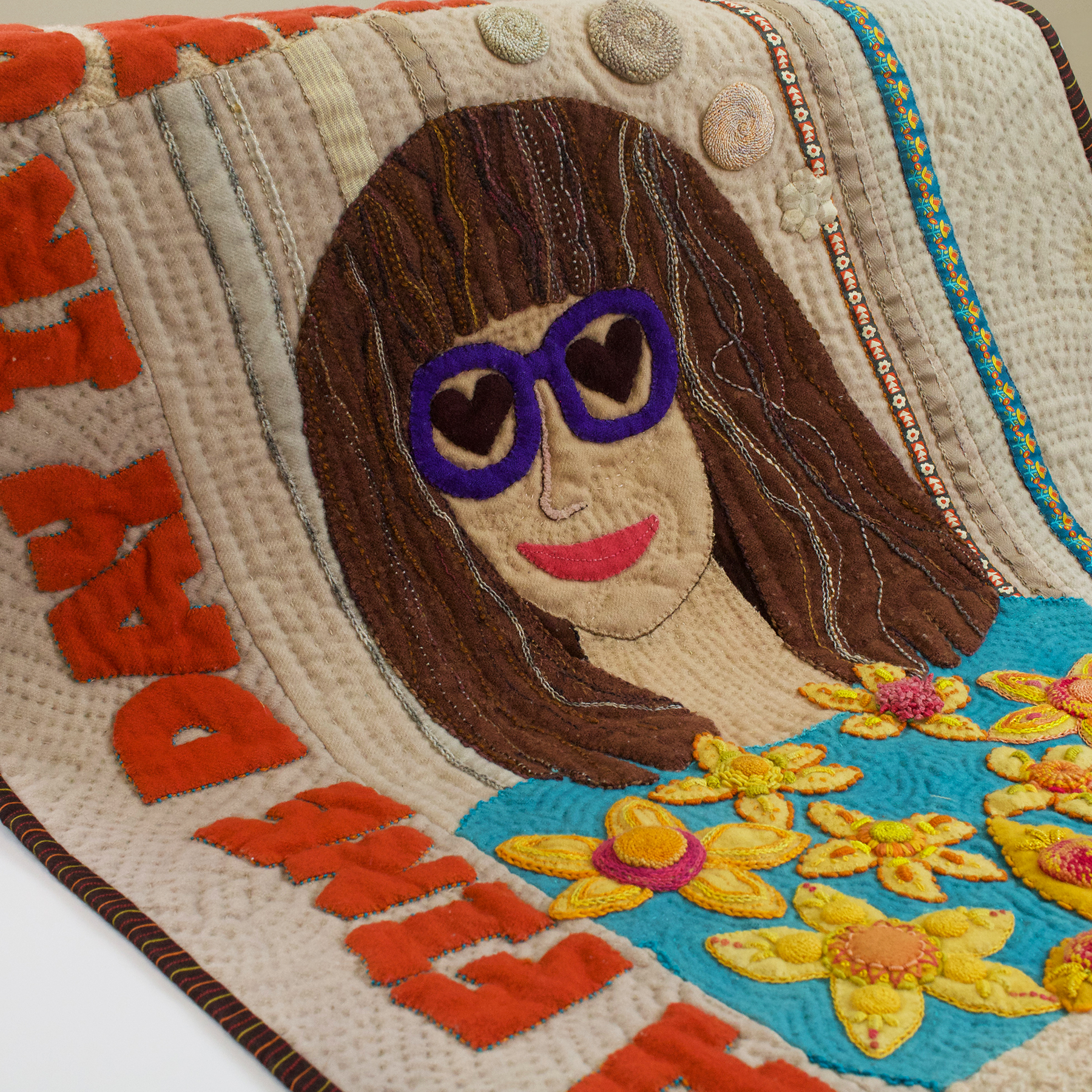 Second only to her love for her family, Janice’s passions for food and quilting have shaped a truly unique creative voice. From her days as a food journalist and “Hamburger Queen” to becoming known across Texas as the “Pimento Cheese Goddess,” her rich culinary history finds new expression in fabric and thread. Trained in traditional quilting techniques in Australia and the UK, Janice transforms classic methods into imaginative works that explore food, narrative, and the tactile beauty of wool appliqué.