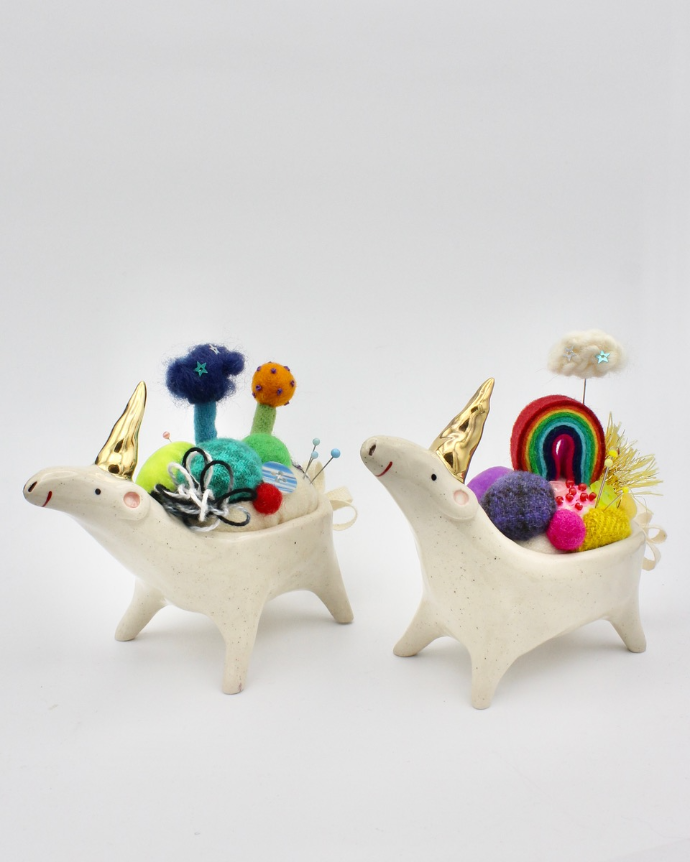 Join Deborah for a truly magical workshop where you’ll create your own Fantasy Landscape Pincushion atop a handmade ceramic unicorn base with a gold luster horn from Fish Museum and Circus. In this hands-on class, you’ll design and build a three-dimensional topographical scene — crafting trees, rainbows, hills, grasses, clouds, and other imaginative landscape elements using a variety of materials. Along the way, you’ll learn simple embroidery stitches to add texture and detail to your creation. By the end of the workshop, you’ll leave with a one-of-a-kind whimsical pincushion and a collection of new skills to inspire future projects.