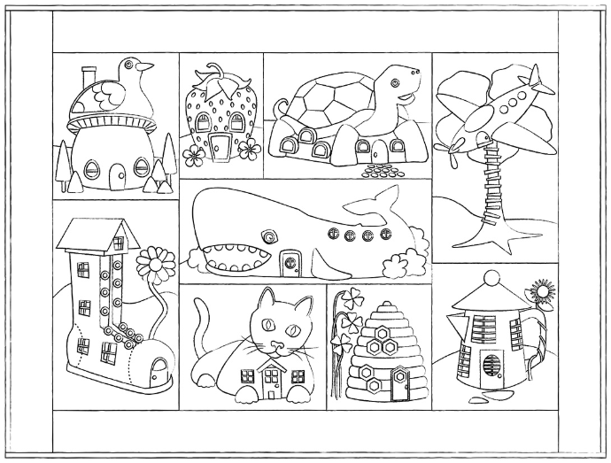This little quilt is inspired by the unusual, playful, and sometimes downright bizarre buildings dotting our cross country roadways. Bending fact into fiction, we’ve created an eccentric little town of themed buildings and homes.