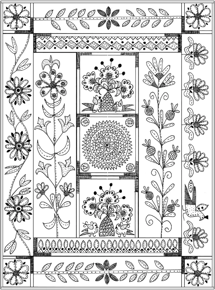 This year’s journey invites you to expand your creative repertoire with fresh techniques influenced by Indian embroidery traditions. Expect richly textured layers, vibrant embellishments, intricate stitching, and playful motifs—all brought to life against a warm latte-colored wool background. The quilt will radiate with bright, saturated threadwork and embellishments, echoing the joyful palettes found in Indian textiles and artistry.
