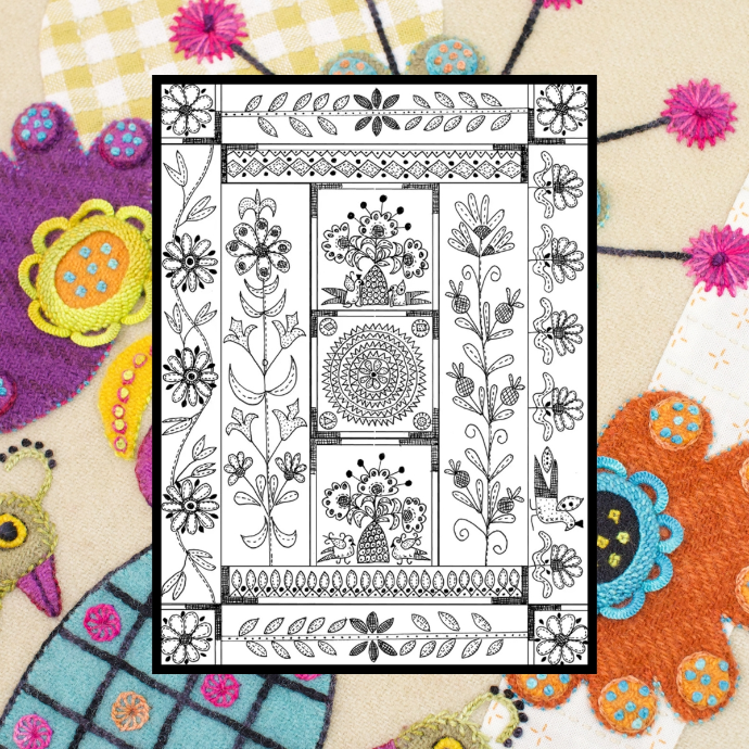 Rooted in the welcoming spirit of the Toran—a decorative hanging placed at the entrance of Indian homes to symbolize hospitality and a warm welcome—this quilt celebrates the joy of inviting others in. Kith & Kin is a versatile statement quilt, designed to hang horizontally or vertically, that brings bold beauty to any space. Explore fresh techniques inspired by Indian embroidery, layered textures, intricate stitching, and joyful embellishments, all glowing against a warm latte wool background with brilliantly saturated threads.