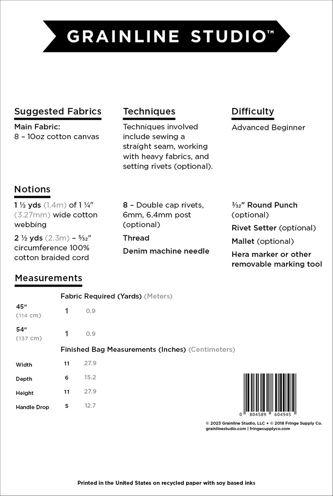 Originally designed and sold by Fringe Supply Co., the Town bag is a great everyday purse and/or a do-it-all project bag, no matter what your project may be. It has the same drawstring closure and interior pockets – designed for corralling tools, patterns, and miscellany – as the Field bag (minus the grommets), but with the addition tote-style handles and external front and back pockets. It's large enough to fit a Field or Stowe bag inside but small enough to fit into a larger bag if needed.